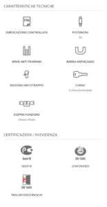 • 15 pistoncini radiali e asimmetrici e 2 perni fissi in acciaio temprato per un altissimo numero di combinazioni cifratura ed una forte resistenza passiva antiscasso.